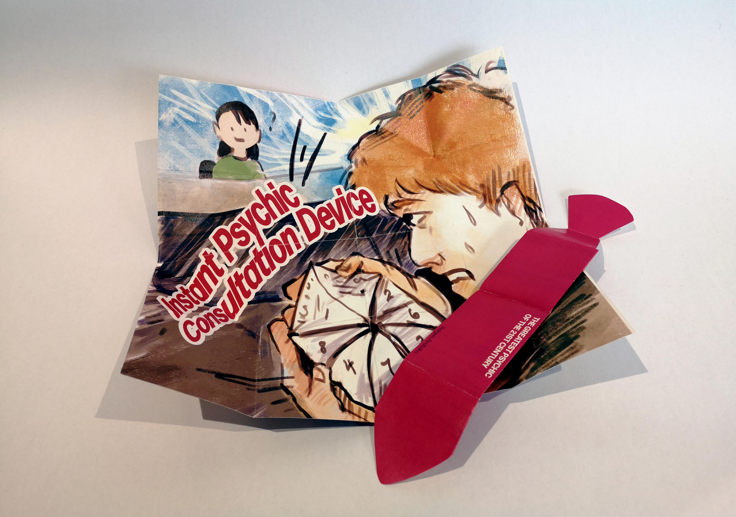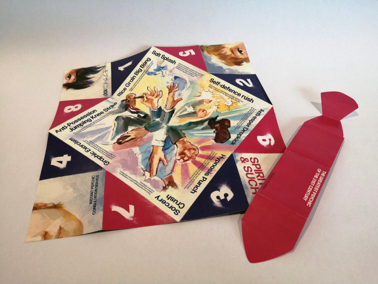 As accompaniment to the poster, I designed an interactive pamphlet that draws inspiration from the somewhat primitive fortune telling ways of our childhoods, serving as a nod to how elementary Reigen's skills truly are.