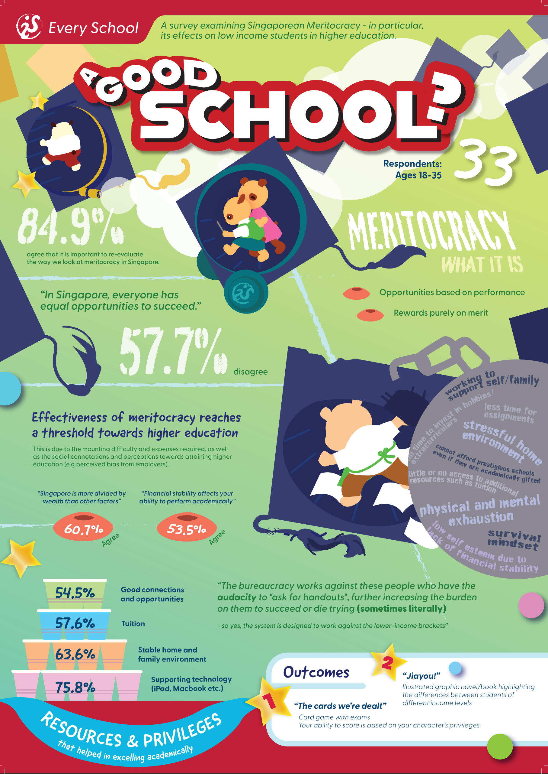 I researched and conducted a survey regarding Singaporean ideals of meritocracy, to gain a better understanding on how to best present my design as a Visual Communications project. Seeing as the biggest barriers appeared to be concentrated on higher education, I focused on that in my final solution.